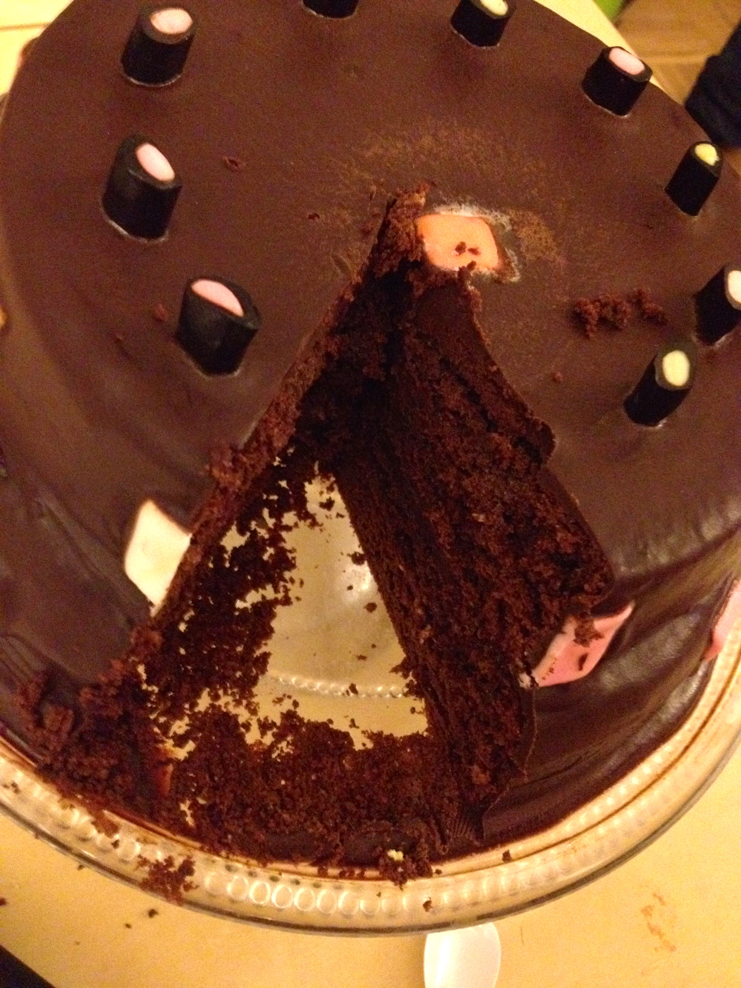 - Verser une bonne dose de nappage au chocolat et étaler en faisant tourner le gateau et avec un très grand couteau (genre couteau à pain)