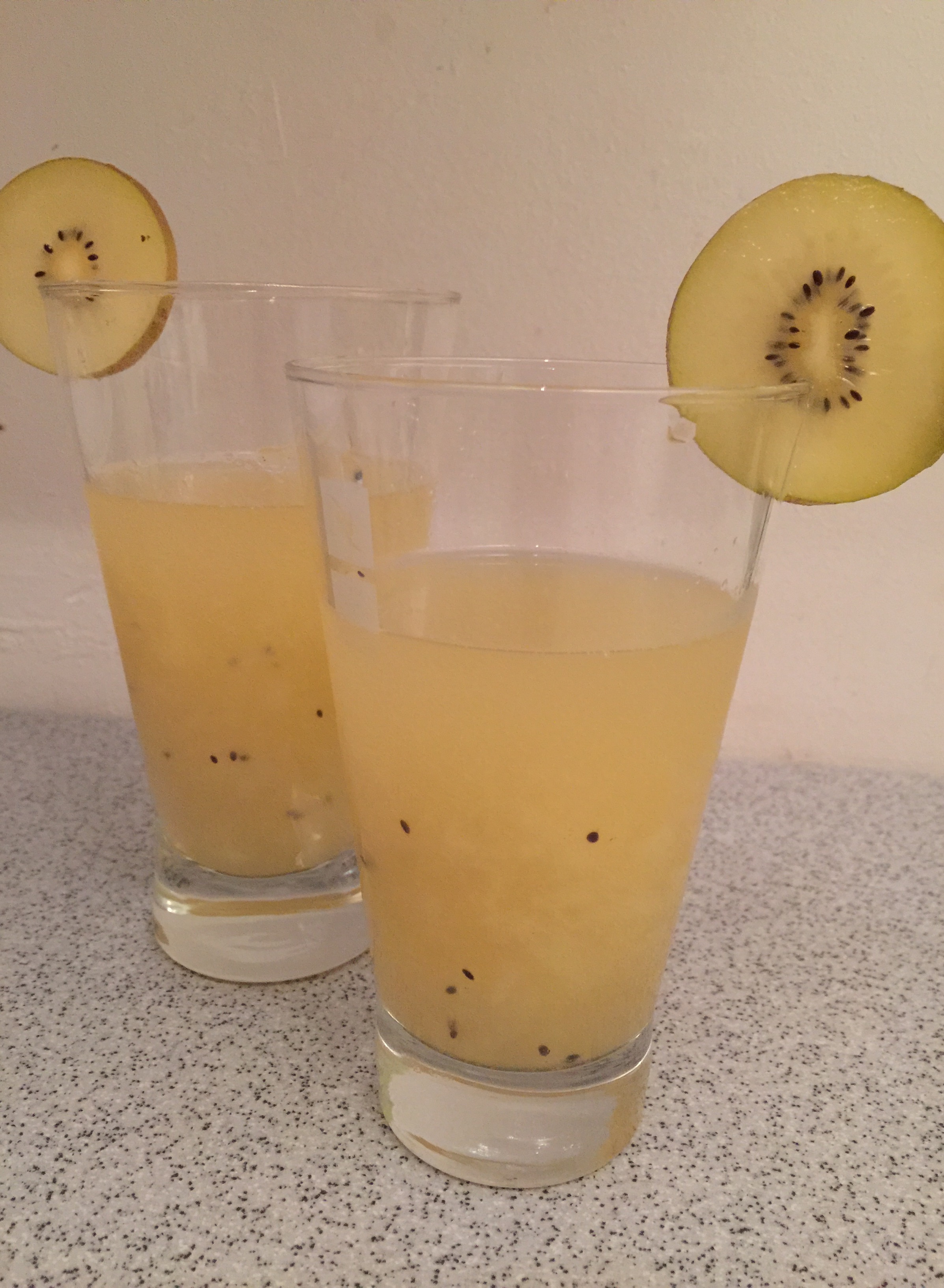 Cette recette n’a rien de diététique et de raisonnable, je vous rassure! Bien au contraire: pour les presque 200 calories par verre, il faut monter une colline environ 30 mn. Mais bon, ce cocktail frais à base vodka et de kiwi descend tout seul alors…