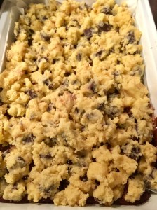 - Parsemer avec les doigts la pâte à cookie sur la pâte à brownies, comme un crumble