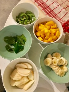 - Prendre 4 bols pour mettre les fruits découpés au fur et à mesure