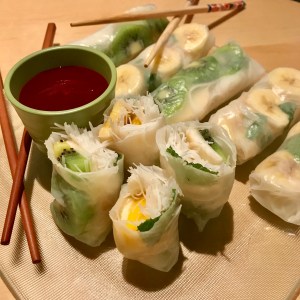Une petite recette de rouleaux de printemps aux fruits frais, en plein hiver? Mes enfants m’ont fait la blague et mon mari aussi. Disons que, c’est pour oublier cette grisaille et redonner des couleurs à notre assiette. Cela permet de varier du traditionnel rouleau de printemps aux crevettes. C’est un dessert original, super sain et frais. Il y a un coup de rouleau à prendre, le reste est enfantin!