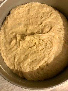 - Laisser lever 1h30 jusqu’à ce que ça double de volume : j’ai fini par chauffer le four 5 mn à 100° et j’ai mis le bol dans le four éteint pour que ça gonfle bien