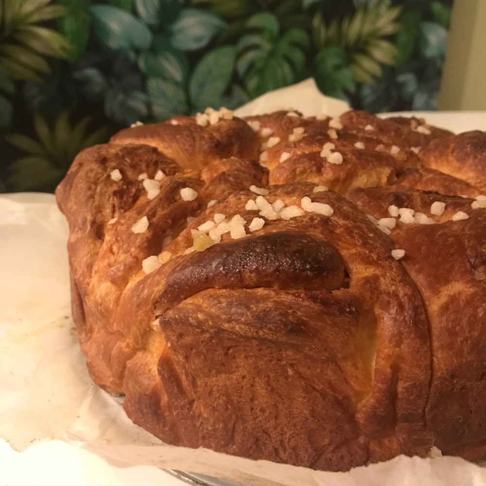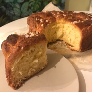 J’avoue, j’ai cédé à l’appel de cette brioche roulée au sucre! En même temps, elle avait vraiment une trop bonne tête et ça sentait trop bon. Les commentaires la bouche pleine de ma fille n’ont pas aidé non plus: “Huumm, c’est vrai qu’elle est bonne cette brioche!”. Bref, je n’ai pas du tout regretté d’avoir mangé une moitié de part et j’ai planqué la brioche pour arrêter de baver dessus!