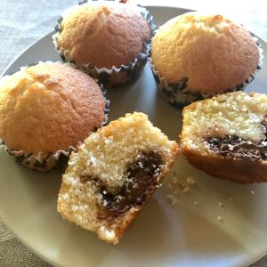 On a essayé les muffins chocolat au cœur chocolat, mais ma fille était déçue que le chocolat durcisse une fois refroidi. On s’est donc lancé dans la recette des Muffins au cœur Nutella. Vu le silence à table quand ils en mangent, j’en déduis que c’est très bon 🙂