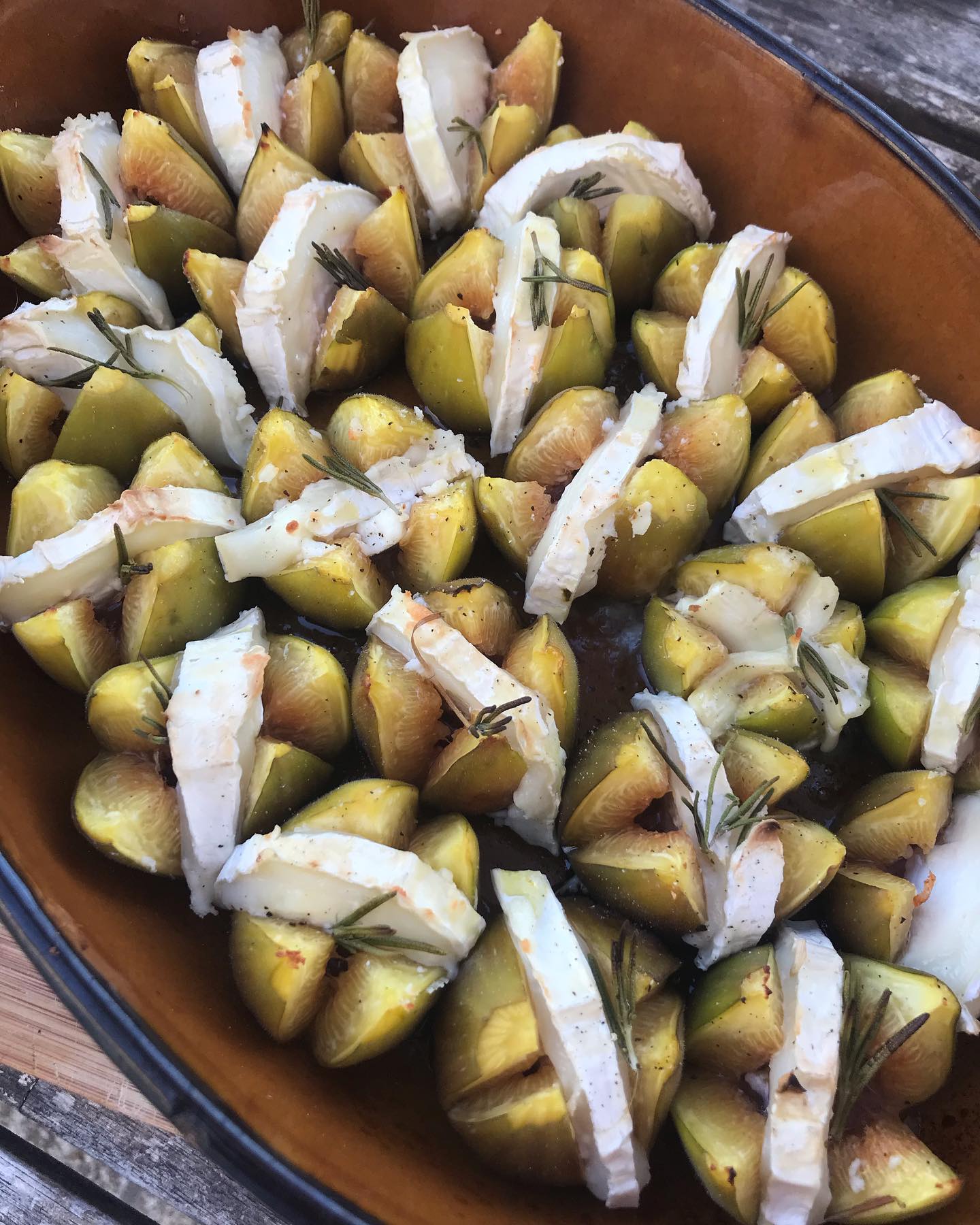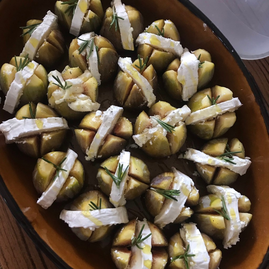 - Couper une demi tranche de fromage de chèvre par figue et l’insérer dans la figue