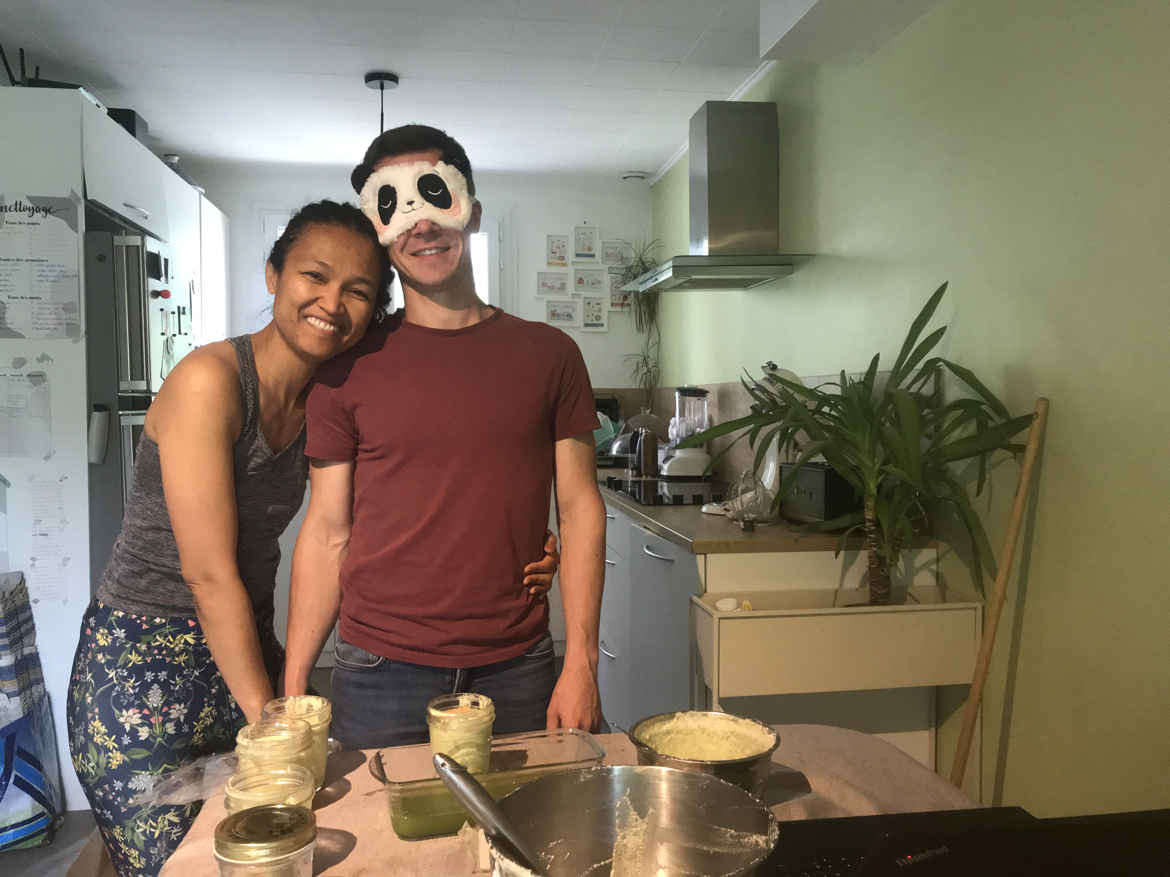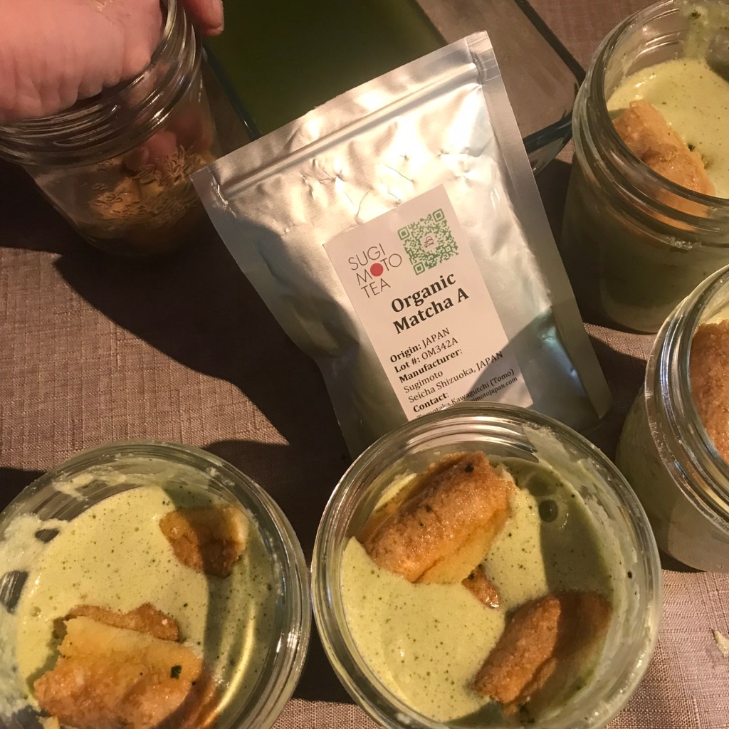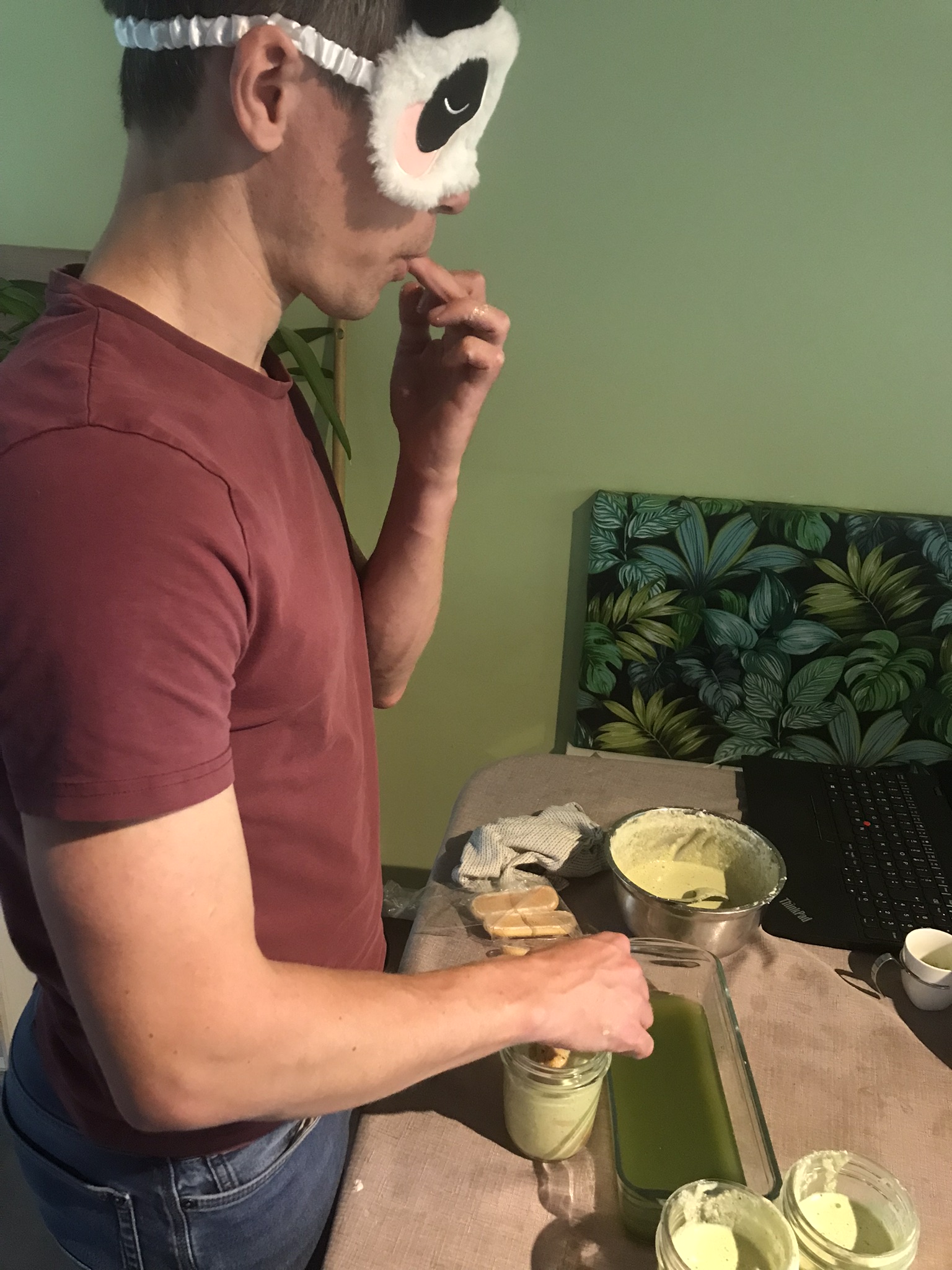 Pour nos 20 ans ensemble, j’ai proposé à mon mari de faire un petit jeu : cuisiner les yeux bandés! C’est une idée du livre The Couple Challenge Book. Et comme une maison de thé japonais m’a récemment offert du vrai thé matcha en contrepartie de quelques bons plans, je tenais absolument à faire une recette avec! C’est délicieux et ça change du tiramisu au café.